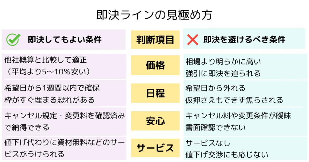 他社の見積もりを取ってる間に埋まってしまったということがないように、一定のラインを決めておきましょう。